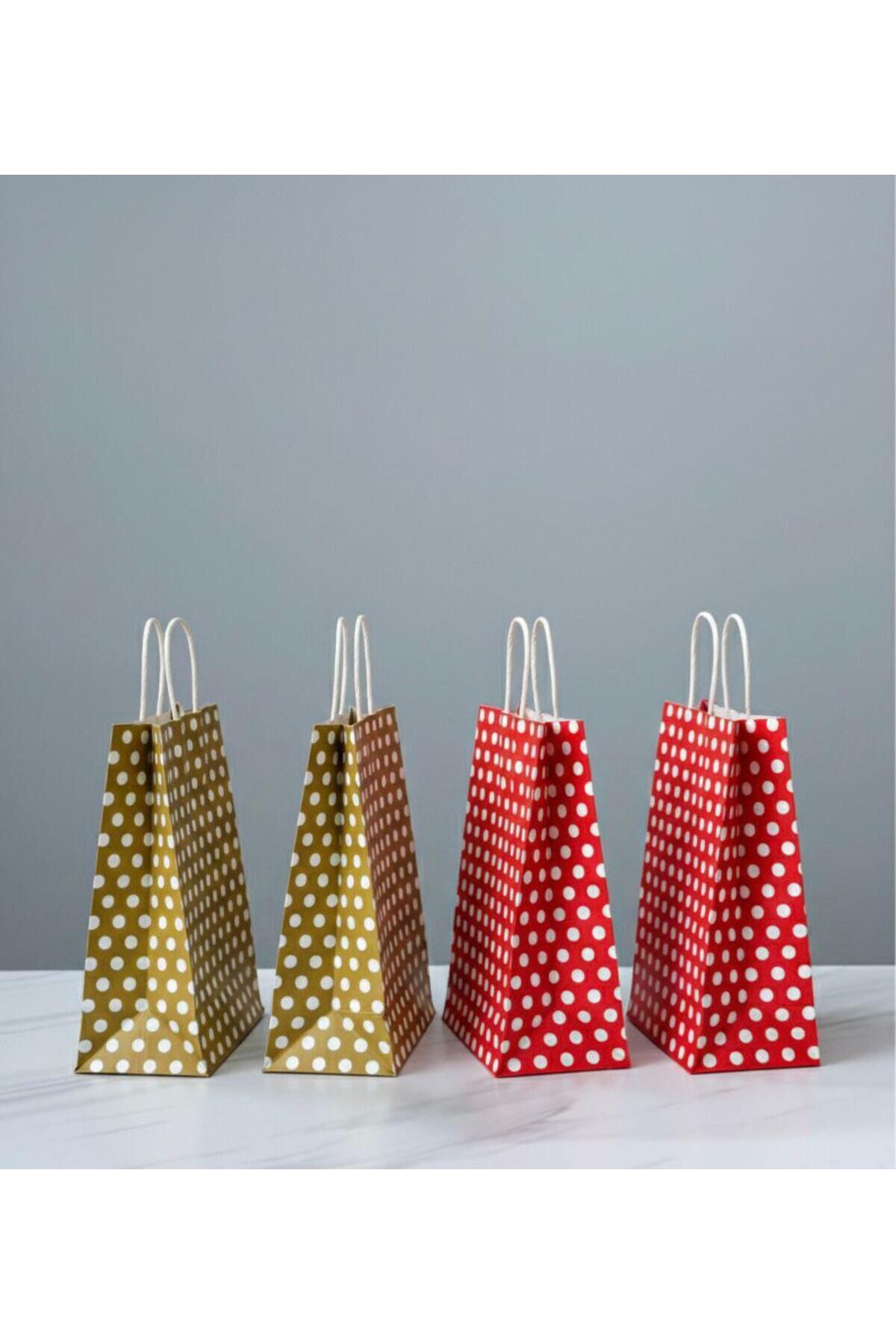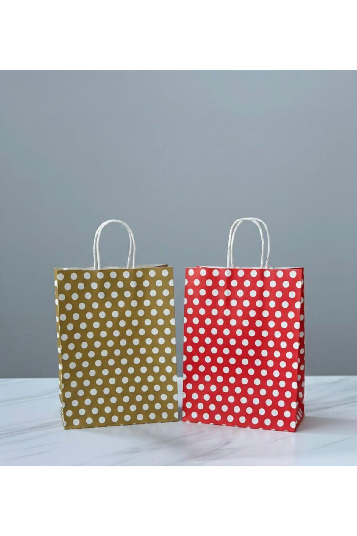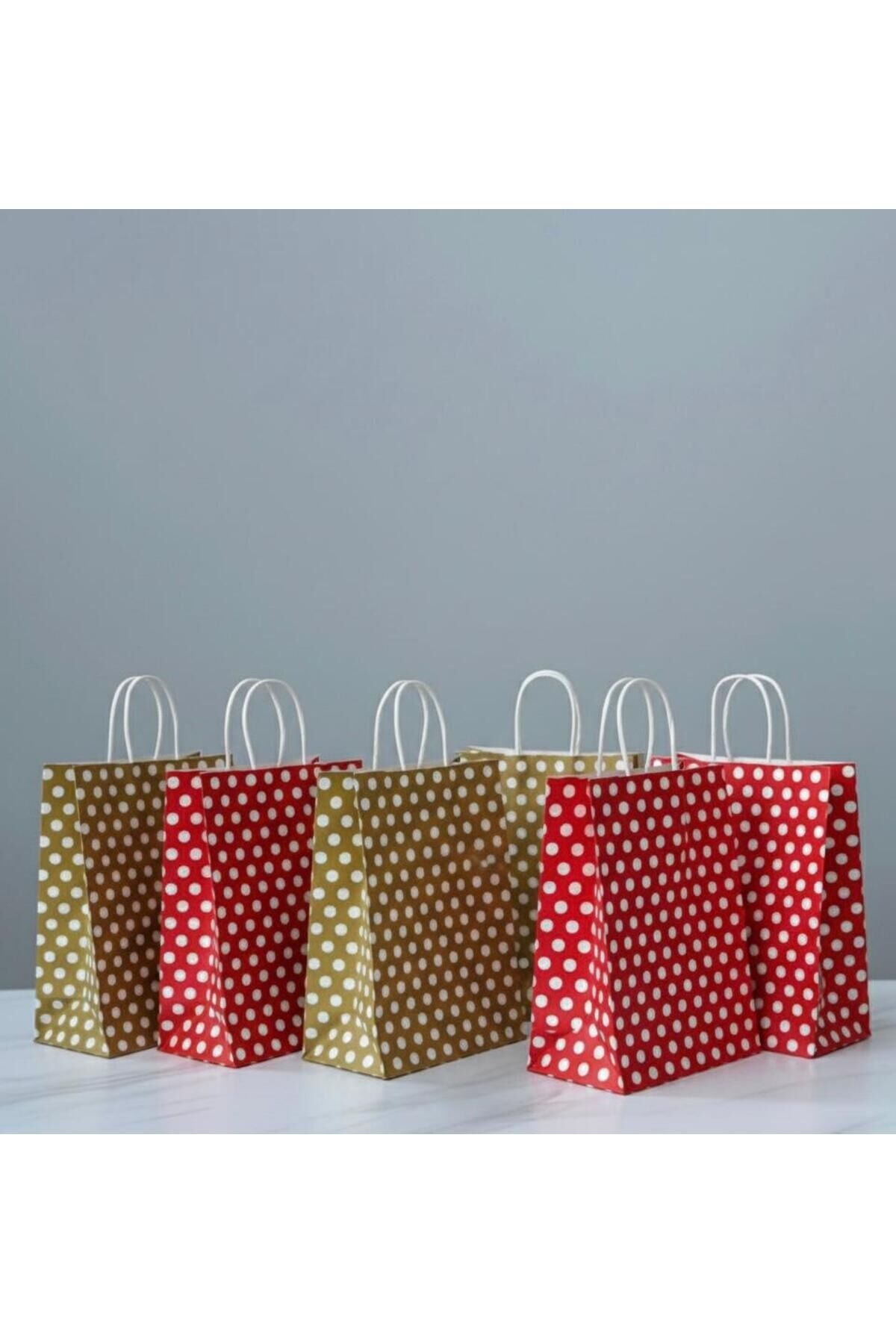 Kırmızı / Gold Renk Beyaz Benekli, Kraft Kağıt Çanta